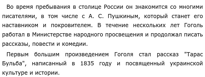 Биография Н. В. Гоголя пример (Гоголь Н. В.)Николай Васильевич Гоголь — выдающийся русский писатель, которого справедливо считают одним из классиков мировой литературы. Его творчество оставило неизгладимый след в русской культуре и искусстве, а его романы, рассказы и пьесы до сих пор остаются актуальными. Гоголь родился 31 марта 1809 года в семье небогатого помещика на Украине. В детстве он увлекался народными преданиями и сказками, а также сопереживал животным и растениям, противостоял материализму, что его часто путешествовал по своей родной земле и собирал народные обычаи и песни. В 1828 году Гоголь переехал в Петербург, чтобы начать новую жизнь в литературных кругах. ![]() Следующая книга "Вечера на хуторе близ Диканьки", также посвященная украинской жизни, стала настоящим литературным событием и получила большую популярность. Однако, наиболее знаменитыми произведениями Гоголя являются его романы "Мёртвые души" и "Ревизор". "Мертвые души" были написаны в 1842 году и стали настоящим шедевром русской прозы. Роман рассказывает о торговце который собрал большое количество крестьянских душ и хочет продать их. "Ревизор" — это комедия, которая написана в 1836 году и стала одним из шедевров мировой драматургии. Это история о молодом чиновнике из Петербурга, которому земские люди по ошибке принимают за инспектора, который приехал на их городской совет. Кроме того, Гоголь был одним из первых авторов, кто занялся созданием русского исторического романа. В своих произведениях Гоголь стремился передать всю эмоциональную глубину и суть героев и рассказывал о многих исторических событиях и личностях Российской империи. К сожалению, на пике своей творческой карьеры Гоголь столкнулся с серьёзными личными проблемами. Он сомневался в своих литературных способностях и двигался в сторону юмора и веселых сюжетов. В конце жизни писатель погрузился в глубокую депрессию и отказался от своей профессии. Николай Васильевич Гоголь умер 21 февраля 1852 года, оставив после себя богатый жизненный опыт и наследие, которые до сих пор являются источником вдохновения для многих людей во всём мире. Его произведения до сих пор не теряют своей актуальности и являются образцом высокой литературы и мастерства. Обновлено: Опубликовал(а): Кирюша Внимание! Спасибо за внимание.