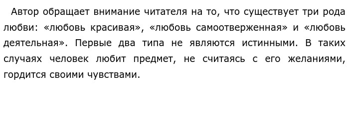 Л. Н. Толстой считает «любовь деятельную» настоящей, ведь в этом случае любят на всю жизнь, не изменяя этому чувству, не меняют предмет любви, просто потому, что он перестал казаться менее красивым, и не желает ему несчастья, лишь бы доказать способность «героически» жертвовать собой. Приведенные примеры дополняют друг друга, показывая, что "истинной" можно считать лишь «любовь деятельную». Я полностью согласна с мнением автора и хотела бы подтвердить свою точку зрения. Так, например, в произведении Л. Н. Толстого «Война и мир» Элен Курагина любит Пьера Безухова за его деньги, капитал, доставшийся ему по наследству. И, конечно же, такая любовь не является настоящей. В произведении Б. Васильева «В списках не значился» можно увидеть «деятельную» любовь. Коля Плужников, заметив, что Миррочке плохо от сухпайка, которым они питались уже долгое время, решился на отчаянный шаг — отправился практически в руки своих врагов, не боясь быть пойманным. Он взял еду пленных женщин, отправленных в крепость разбирать завалы, честно оставив взамен привычные ему сухари. Лейтенант не сказал Мирре о том, откуда взял вареную картошку, но этим поступком сделал девушку немного счастливее. Такую любовь, несомненно, можно назвать настоящей. Таким образом, можно прийти к выводу, что по-настоящему любят не те, кто обещает совершить ради предмета любви подвиг, а те, кто подтверждает свои чувства поступками. Тихими, не привлекающими внимания, но оттого ещё более ценными. Обновлено: Опубликовал(а): Алексеенко Серафима Дмитриевна Внимание! Спасибо за внимание. Полезный материал по теме