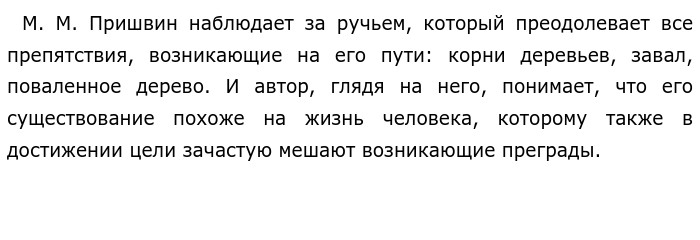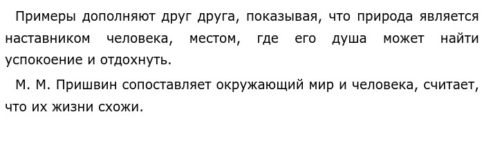 Какова роль природы в жизни человека? По тексту М. М. Пришвина «Если хочешь понять душу леса, найди лесной ручей и отправляйся по его берегу вверх или вниз…» (ЕГЭ по русскому)Какова роль природы в жизни человека? Именно над этой проблемой размышляет М. М. Пришвин. Автор описывает свою прогулку по лесу. Он любуется природой, её многообразием и размеренной жизнью. М. М. Пришвин говорит, что его «глаз обласкан», ему стало «так, что лучше и быть не могло». Душа человека находит успокоение не в шумных городах, среди пыли дорог, а на природе. А. Платонов в произведении «Юшка» показывает нам, что люди могут по-настоящему отдохнуть только тогда, когда любуются красотой окружающего мира, находятся в единении с ним. Так, например, главный герой книги идет по дороге и с восторгом наблюдает за всем, что его окружает, боится причинить вред даже совсем крошечным букашкам. И в этот момент Юшка забывает даже о мучившей его чахотке и обидах, нанесенных жителями деревни. ![]() В такие моменты природа становится учителем для людей. В романе-эпопее Л. Н. Толстого «Война и мир» князь Андрей Болконский после смерти своей жены в течение двух лет не может прийти в себя, вернуться к прежней жизни. В это время он видит старый, безжизненный дуб, с которым и сравнивает себя. Однако после встречи с Наташей Ростовой князь вновь замечает дерево, но на нём, к его удивлению, распускаются почки, оно оживает, и это радует героя. Андрей Болконский меняет своё мнение и убеждает себя в том, что жизнь ещё не окончена. ![]() Однако люди без природы существовать не смогут, тогда как она без них — вполне. Я разделяю мнение автора. Роль природы в жизни человека огромна. Она его учитель, друг и единственный верный помощник, который никогда не предаст и не обманет. Обновлено: Опубликовал(а): Алексеенко Серафима Дмитриевна Внимание! Спасибо за внимание. Полезный материал по теме