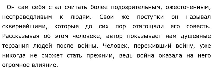 Оба примера дополняя и раскрывая друг друга показывают, какое влияние оказывает война на человека, человек меняет свое видение, мнение о жизни. Даниил Гранин убежден что война не уходит из жизни человека, она остается где-то рядом, меняя характер человека и его отношение к миру. Я полностью разделяю позицию автора и считаю, что война меняет людей, оказывая огромное влияние на внутренний мир человека. После всех ужасов войны даже самые сильные люди духом меняются, ведь война оставляет свой след в жизни человека. Мой прадедушка Иван Васильевич прошел Великую Отечественную войну, пережив всю жестокость этого страшного события. Он никогда не рассказывает об этом времени, ведь для него это страшные воспоминания, после которых у него всегда появляются слезы на глазах. Война останется у него в памяти навсегда, она полностью поменяла его. Таким образом, автор побудил нас задуматься о жестокости войны, которая имеет сильное влияние на жизнь человека. Она разрушает его изнутри, оставляя в душе тоску, от которой нельзя избавиться даже спустя многие годы. Обновлено: Опубликовал(а): Ася Филатова Внимание! Спасибо за внимание. Полезный материал по теме