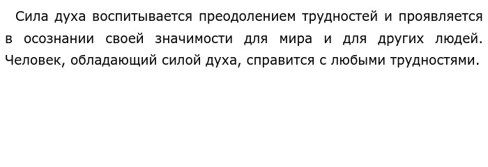 Сила духа по А.Овчинниковой (ОГЭ по русскому)Что такое сила духа? Попробуем поразмышлять над этим понятием. По моему мнению, сила духа - это способность человека противостоять сложностям и трудностям, которые встречаются в жизни. Сила духа - это умение не сдаваться в любой сложной ситуации. Обратимся к тексту А. Овчинниковой, в котором говорится о трудных испытаниях, выпавших на долю детей, во время блокады Ленинграда. В предложениях 4-5 говорится о том, что девочки многое испытали, но не сдались и вернулись во Дворец пионеров, чтобы продолжить заниматься творчеством. Хоть они и были потрясены войной, но нашли в себе силы верить в своё светлое и безмятежное будущее. "Искусство помогало" выжить не только детям, но и морякам на корабле, которые прошли через суровые военные испытания, но со слезами восхищались силой духа ленинградских школьников. В качестве подтверждения приведу пример из художественной литературы. В рассказе Михаила Шолохова "Судьба человека" главный герой прошёл через суровые испытания на войне : плен, потеря семьи, но он сумел не только найти в себе силы продолжать жить дальше, но и дал возможность мальчишке - сироте обрести семью. Он выдержал все испытания, чтобы отстоять свою страну. Эти подвиги — наглядная демонстрация силы духа. Таким образом, сила духа проявляется в стойкости, мужестве, способности переживать трудности, в умении жить ради других. Сила духа, по моему мнению, самое важное качество человека. ![]() Обновлено: Опубликовал(а): Валерия Лукина Внимание! Спасибо за внимание. Полезный материал по теме