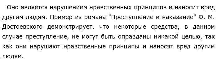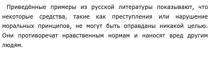 Какие средства не могут быть оправданы никакой целью? Аргументы Ф. М. Достоевский «Преступление и наказание», Л. Н. Толстой «Анна Каренина» (Итоговое сочинение (декабрьское))Существует понятие оправдания средств целью, которое часто вызывает дискуссии и споры. В данном сочинении рассмотрим вопрос о том, какие средства не могут быть оправданы никакой целью. Будут представлены примеры из русской литературы, которые помогут нам проиллюстрировать эту идею. Одним из примеров, иллюстрирующих неоправданные средства, может служить образ героя романа "Преступление и наказание" Ф. М. Достоевского — Раскольникова. В своем стремлении осуществить идею "высшей справедливости" и "освободиться от ограничений", он совершает преступление, убив старушку-процентщицу. Несмотря на его мотивацию борьбы с социальными неравенствами, преступление, которое он совершает, не может быть оправдано никакой целью. ![]()