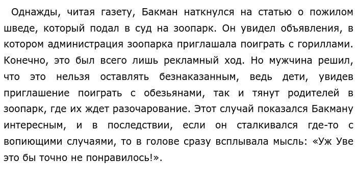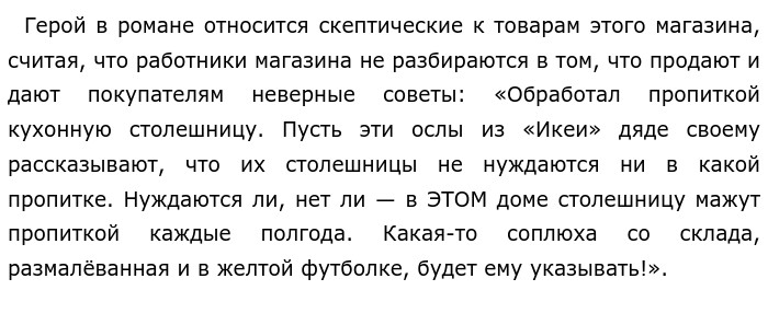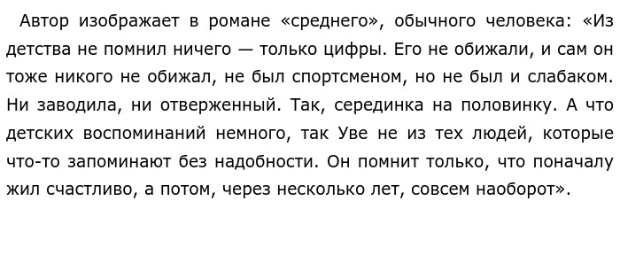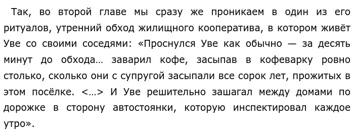 «Вторая жизнь Уве» (Читательский дневник)![]() Так история, сначала появившаяся в блоге Бакмана, стала сюжетом целой книги. Роман по большей части строится на описании жизни героев, погружённой в повседневность. Жизнь главного героя разделена на две части, границей которых является смерть любимой жены, после чего прежняя жизнь невозможна. Перед нами предстаёт 59-летний рабочий завода по имени Уве. Вся его жизнь устроена по принципам рациональности и практичности, например, он не видит смысла в пустых разговорах и рассуждениях. ![]() Он всегда находит прелесть в том, чтоб изо дня в день делать одну и ту же работу. Вся жизнь главного героя протекает в постоянном движении, но движение это идёт по кругу: дом — работа — дом — работа. Именно эта стабильность является основой комфортной для Уве повседневности. Но неожиданно героя «отправляют на заслуженный отдых», показывая тем самым бесполезность Уве для нового общества, для новых темпов жизни. Это выбивает его из колеи и заставляет задуматься о самоубийстве. С самого детства Уве привык выполнять всё по определённому порядку. Жизнь Уве ритуализирована настолько, что в ней нет места каким-то неожиданным событиям. ![]() И даже свой отход в мир иной Уве стремится организовать по всем правилам, ритуализируя это действие: продумывая каждый раз все этапы и последующие шаги нашедших его тело. В мотиве постоянных попыток самоубийства обнаруживается ещё одна черта характера Уве – постоянное стремление к порядку. Описывая тщетные попытки самоубийства, Бакман упоминает то, как старик тщательно очищает, стремится обезопасить место самоубийства, а при попытке угореть в автомобиле Уве думает лишь о том, сколько впустую истратится бензина. В итоге герои романа настолько привыкают к педантичности и обязательности Уве, что в нечищеной дорожке перед его домом видят верный признак смерти героя. Жизненный путь героя раскрывается в романе посредством наличия в ткани текста образа постоянства марки его машины. Главный герой никогда не изменяет выбранной им однажды марке «Сааб»: «Именно в тот вечер восьмилетний Уве решил, что будет ездить только на «саабе» и ни на чём больше». Проявляя настолько рьяное постоянство и консерватизм, герой создаёт вокруг себя идеальную атмосферу, в которой совсем нет никаких потрясений и неожиданностей, ведь именно отсутствие контроля он ненавидит больше всего. Сосед Уве Руне является своеобразным "двойником" главного героя: Руне имеет аналогичное мнение по поводу жизни вокруг. Однако разные мнения об одной и той же мелочи сделали из друзей врагов. Так смена Руне марки машины стала самым большим разочарованием для Уве. В романе присутствует знакомая многим сеть магазинов мебели и товаров для дома IKEA, в одном из магазинов которой Уве покупает верёвку, желая повеситься. ![]() Можно предположить, что IKEA в произведении является символом массовой потребительской культура, тогда как Уве при своей консервативности является сторонником индивидуальности. Одним из основных движущих сил в жизни Уве являются потрясения. Активные действия в жизни героя происходили в тот момент, когда привычный ход вещей нарушался каким-либо «инородным» для его повседневности событием. Обратимся к истории знакомства героя с будущей женой, Соней. По воле случая Уве стал работать ночным мойщиком вагон