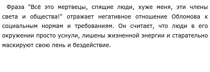 «Всё это мертвецы, спящие люди, хуже меня, эти члены света и общества!» по роману Обломов (Гончаров И. А.)Роман И. А. Гончарова "Обломов" рассказывает о жизни главного героя, Ильи Ильича Обломова, человеке, полностью погруженном в лень и бездействие. Одной из ключевых тем, затрагиваемых в произведении, является тема отношения Обломова к окружающему миру и обществу. ![]() Обломов не видит смысла в стремлении к успеху и материальной благополучности, он предпочитает пассивность и безразличие. Поведение Обломова вызывает у него самого недовольство и критику. Он осознает, что пребывает в состоянии спячки и неспособен преодолеть свою лень. При этом обостренное восприятие общества и его членов, которые он считает "мертвецами", позволяет ему осознать свою отличность от них. Обломов не хочет быть таким же как они, человеком, заключенным в рамки социальных ожиданий. Утверждение Обломова может вызывать споры и разные точки зрения. Многие люди, включая его близких друзей, считают его бездельником и парализованным нерешительностью. Они видят его отказ от активной жизни как проявление лени и неспособности взять на себя ответственность. Однако, Обломов не согласен с такой оценкой и считает, что его нежелание вступать в гонку суеты и достижений — это осознанный выбор. В конце романа происходит некоторое преображение Обломова: он осознает свои ошибки и пытается изменить свою жизнь. Возможно, он по-прежнему не принимает все аспекты общества, однако, его пассивность в существенной мере смягчается. Возможно, эта изменчивость и поиск собственного пути является некой альтернативой между просыпающимися "мертвецами" и Обломовым, не хотящим проснуться. В итоге, можно сказать, что фраза "Все это мертвецы, спящие люди, хуже меня, эти члены света и общества!" является выражением героя романа И. А. Гончарова "Обломов". Эта фраза отображает его отношение к окружающим и его нежелание вступать в игру общественных норм и требований. Обновлено: Опубликовал(а): zordone Внимание! Спасибо за внимание.