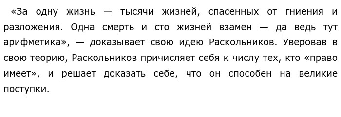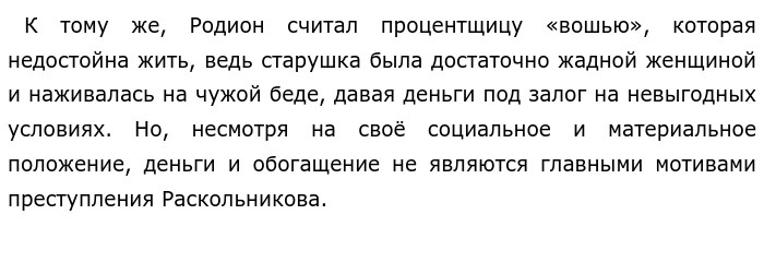 | Согласны ли вы с точкой зрения Д. И. Писарева, что причина преступления Раскольникова таится «не в мозгу, а в кармане»? по роману Преступление и наказание (Достоевский Ф. М.)Человек, как существо социальное, способен жить только в обществе, среди людей. Взаимодействуя с окружающими людьми, человек выстраивает свою определенную модель поведения. Абсолютное большинство людей ведет себя в обществе добропорядочно. Но существуют люди, поведение которых не соответствует моральным требованиям, противоречит общепринятым в обществе образцам поведения. Такое поведение опасно для окружающих. Одним из наиболее опасных социальных деяний является преступление. Но от чего же люди идут на преступление, зная о его тяжёлых последствиях? В одном случае, причиной преступления может являться негативное влияние на человека со стороны маргинальных групп или социальной среды в целом. В другом случае, причиной является низкий уровень жизни в обществе, в данном случае люди идут на преступление, чтобы приумножить своё состояние или просто выжить. Данный список можно продолжать долго. Так, в романе Ф. М. Достоевского «Преступление и наказание» главный герой Родион Раскольников тоже совершает преступление — убивает старуху-процентщицу и её сестру. Но что же подтолкнуло молодого человека на такой жестокий поступок? Литературный критик Д. И. Писарев предположил, что причина преступления Раскольникова таится «не в мозгу, а в кармане». Так ли это на самом деле? Безусловно, социальное и материальное положение молодого студента было плачевным. Родион снимал низкую каморку под самой кровлей, в которой почти не было мебели. При виде Раскольникова прохожие «шарахались», ведь внешний вид молодого человека был неприятный — одежда молодого человека представляла собой лохмотья, а обновить гардероб он не мог себе позволить. Раскольников не всегда даже мог заплатить хозяйке за обед. Со временем Родиона исключают из университета по причине неуплаты своего обучения. Молодой человек был буквально «задавлен» бедностью. Конечно, Родион пытался хоть как-то обеспечить себя — он преподавал уроки детям, но вырученных средств не хватало, чтобы покрыть все долги. Познакомившись с процентщицей, которая являлась необычайно богатой женщиной, Родион стал часто закладывать у нее различные ценные вещи. Убив богатую старушку Раскольников смог бы закрыть долги и выбраться из нищеты.