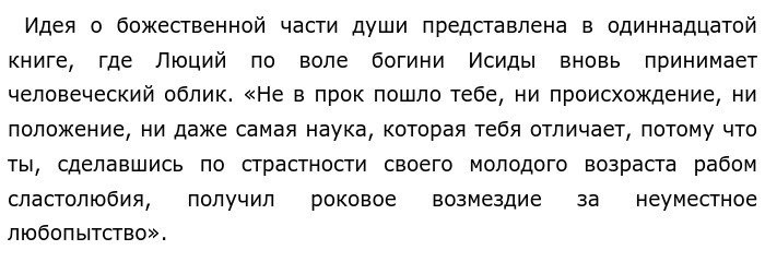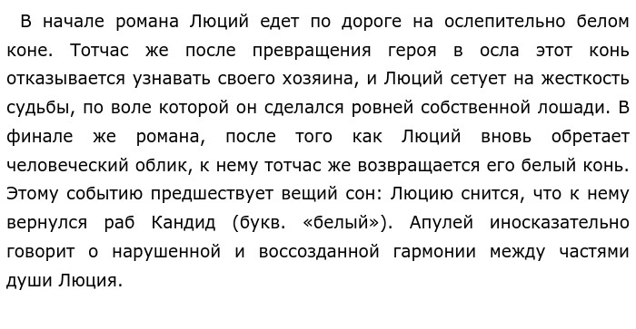 Анализ романа «Метаморфозы, или Золотой осел». Роль вставных новелл (Античная литература)Наиболее известный и любопытный памятник литературы 2 века н. э. «Золотой осел» Апулея. Во вступлении автор называет роман «греческой повестью» и отмечает, что он написан в «милетском» стиле. Произведение представляет собой переработку «Лукия или осла» Лукиана. Переработка Апулея отличается рядом признаков: «Золотой осел» значительно больше по объему греческого «Лукия или осла», имена в романе латинизированы (Лукий-Луций), роман Апулея отличается своеобразием композиции и концовкой (вмешательство Исиды). В произведении присутствуют многочисленные вставные истории и рассказы, которые не связаны с основным сюжетом. Роль вставных новелл не просто орнаментальная. Они обеспечивают читателю необходимый фон для понимания повествования романа. В философии Платона было учение о тройственной иерархии мироздания и аналогичном этой иерархии устройстве человеческой души. Всякая душа — трехчастна. ![]()