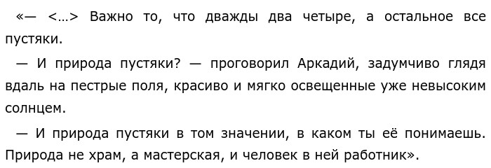Как видят мир Евгений базаров и Аркадий Кирсанов? Какая позиция ближе автору? (Тургенев И. С.)Несмотря на то, что Аркадий Кирсанов на протяжении долгого времени старается быть похожим на Евгения Базарова в убеждениях и принципах, как бы следуя вместе с ним направлению нигилизма, мы видим существенную разницу между данными персонажами через их взгляды на мир. Очень хорошо эта разница отражена в части диалога героев: ![]()