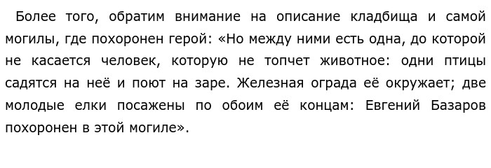 Могила кажется обособленной от всего кладбища, она заметно выделяется среди остальных захоронений. Тургенев проводит черту между Базаровым и обществом, миром в целом. Он чужд для всего вокруг и существует будто в совсем другом временном промежутке. Исходя из всего указанного выше, можно предполагать, что позиция Аркадия, вместе с его мечтательностью, соответствием времени и нравам, мягкостью во всех мыслях и действиях, были Тургеневу ближе. Именно они продолжили жить. Обновлено: Опубликовал(а): Настасия Внимание! Спасибо за внимание.