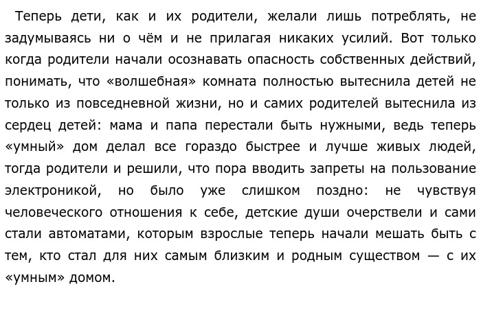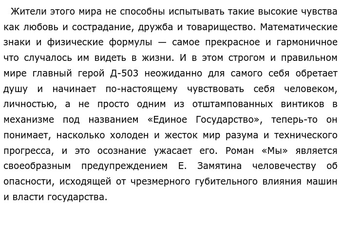 Техника убийственно действует на душу аргументы Р. Брэдбери «Вельд», Е. Замятин «Мы» (Итоговое сочинение (декабрьское))«Техника убийственно действует на душу» — эти слова принадлежат Николаю Александровичу Бердяеву, русскому философу и социологу. Это высказывание как никогда актуальна для размышления в современной философии. Действительно, сейчас, живя в эпоху научно-технического прогресса, век информационных технологий (а именно это и подразумевает Н. А. Бердяев под термином «техника»), когда всевозможные изобретения и технологические новшества всё чаще приходят на смену человеческому умственному и силовому труду, сложно не согласится с этим высказыванием, ведь теперь человек обезличился, он потерял свою ценность и значимость, у него нет желания развиваться и расти духовно («душа» и «духовность» же понимается Бердяевым как внутренний мир человека, его убеждения и жизненные ориентиры, переживания, настроения, чувства, весь калейдоскоп эмоций), нет больше стремления познавать мир. Невозможно не отметить и парадоксальную составляющую этого явления: изначально технические изобретения создавались с целью сделать возможности человечества безграничными, но они же, сами по себе, и делают человека ограниченным. «Зачем мне что-то учить наизусть или считать что-то самостоятельно, если вместо этого я могу воспользоваться техническим изобретением или просто-напросто «загуглить» что-либо?» — так считает большинство взрослых людей, но самое страшное, что так думают и школьники, которым от природы, в силу возраста должны быть свойственны желание исследовать и познавать мир. Кроме того, технический прогресс пагубно влияет на духовность человека, она притупляется, поскольку все цели и желания направлены лишь на эгоистичное удовлетворение лишь своих потребностей. Высоконравственные ориентиры стираются, уступая дорогу аморальности и порочности. Так, например, в рассказе Р. Брэдбери «Вельд» было показано как научно-технический прогресс был направлен против людей, вот только направили его не восставшие машины или жестокие враги-убийцы, а непосредственно эти же самые люди. Композиционным центром рассказа является обычная американская семья: отец, мать и двое детей — сын и дочь. Родители всячески оснащали свой дом самыми высокотехнологичными изобретениями, баловали детей, тратя на них не своё время и душевные силы, а лишь свои деньги. Так в их «умном» доме и появилась необычная детская комната, все стены которой были оснащены мониторами виртуальной реальности, которые могли транслировать всё что угодно. ![]() И вот, встретив на своём пути размеренной и беззаботной жизни препятствие в виде запрещающих родителей, дети не нашли ничего лучше, кроме как устранить его — убив их. Но убили дети не только своих родителей, но и свои души, ведь убийство – самое страшное злодеяние, оправдать которое невозможно. Та иллюзия счастья, которая была создана техническим прогрессом никогда уже не заменит брату и сестре настоящего счастья, ведь с ненавистью и грехом в душе это невозможно. Именно об этом предложил нам задуматься талантливый писатель-фантаст Р. Брэдбери, указывая и на то, что не сам технический прогресс убивает души людей, но неумение грамотно пользоваться его благами — вот что по-настоящему убийственно для души. Рассуждая дальше, можн