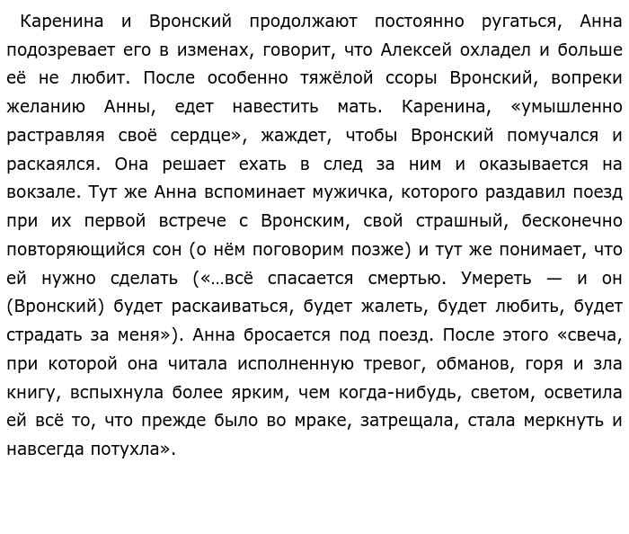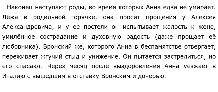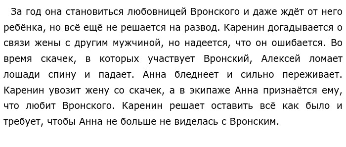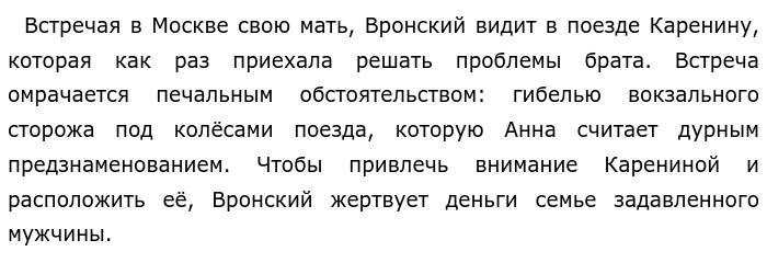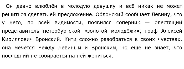Пересказ романа «Анна Каренина» (Толстой Лев Н.)История начинается со знаменитой фразы, которая знакома почти каждому: «Все счастливые семьи похожи друг на друга, каждая несчастливая семья несчастлива по-своему». В доме Облонский разлад, Долли нашла письмо своего мужа к гувернантке, то есть уличила в измене. Чтобы помирить супругов в Москву едет сестра Степана Аркадьевича (Стивы), никто иной как Анна Аркадьевна Каренина. Анна быстро решает семейную драму Облонских, и Долли прощает измену мужа. Параллельно развивается линия старого друга Стивы, Константина Дмитриевича Левина. Левин прибывает в Москву, встречается с Облонским и расспрашивает Стиву о младшей сестре его жены, княжне Кити Щербацкой. ![]()