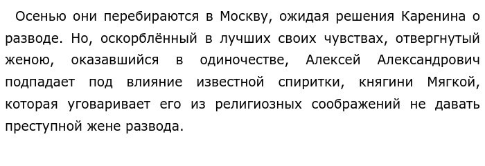 После примирения семья Облонских и Щербацких приглашает Анну на бал. Для Кити этот бал очень важен, она надеется, что Вронский признается ей в чувствах. Пока дом Щербацких готовиться к светскому мероприятию, приезжает Левин, чтобы объясниться с Кити, но получает отказ. Во время балла все надежды и мечты Кити рушатся: Вронский и Анна мило беседуют, переглядываются и танцуют. После балла расстроенный Левин уезжает в деревню, Кити долго болеет, мучается и в конце концов отправляется лечиться за границу, а Анна возвращается в Петербург к сыну и мужу, влюблённый Вронский следует за ней. Жизнь в Петербурге предстаёт Анне в новом свете и теперь тяготит её. Есть очень интересный момент, который это хорошо показывает. Выходя из поезда на петербургской станции Каренина видит мужа и впервые обращает внимание на его большие и растопыренные уши. Вроде мелочь, но Анна окидывает привычную ей жизнь совершенно новым взглядом. ![]() За это она «будете пользоваться правами честной жены, не исполняя ее обязанностей». Очевидно, Каренина не принимает условия мужа. ![]()