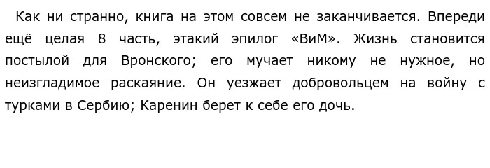И снова мы возвращаемся к линии Левина, который живёт в деревне и пишет книгу о хозяйстве. В романе уделяется действительно много времени жизни Константина в деревне, его связи с народом и единению с природой. Немного опущу, но Кити и Левин вновь встречаются, вспыхивают прошлые чувства и они женятся. Пока молодожены притираются, вечно ссориться и мирятся, из Италии возвращаются в Петербург Анна с Вронским. Очевидно, что репутация у Карениной совсем не очень, многие знакомые, светские дамы отказываются принимать Анну и даже разговаривать с ней. Женщина понимает, что свет переменился к ней и очень мучается, потому что не может выйти из дома, даже начинает писать детскую книгу. Вронский как и прежде гуляет, ходит по кабакам, выезжает в свет. Плоды супружеской неверности пожинает только Анна. Тут трудно ухватить верную хронологию, поэтому вернёмся к Левину и Кити. Константин узнаёт, что его старший брат Николай лежит при смерти, и решает приехать. Кити уговаривает мужа взять её с собой. Тут происходит важный момент — осознания человеческой смертности. Брат умирает, но Левин узнаёт, что Кити беременна. Параллельно Анна и Алексей живут в имении Вронского. Каренина мучается всё сильнее, балуется морфином и опиумом. Набравшись храбрости, Долли приезжает к ним. За роскошью, которой окружена Анна, Долли видит, не ту естественную и искреннюю женщину, жизнь Карениной теперь полна фальши и лицемерия. Отношения между любовниками становятся всё напряженней, Анна вечно ревнует, старается заменить Вронскому целый мир, но безуспешно. ![]()