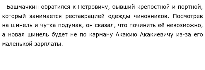 ![]() Башмачкин одев её, был очень горд, как Петрович своим творением. В департаменте из-за неё тоже произошли изменения. Когда коллеги Башмачкина узнали что больше нет того «капота», стали поздравлять его, что ему стало почему-то стыдно. И предложили «спрыснуть» его шинель. Но вскоре Башмачкин лишается своей шинели из-за вечеринки, которую устроило начальство. Это было «вспрыскивание» и именины, от которого главный герой не смог отказаться. Там его напоили и накормили, поэтому он сильно задержался и пришел домой поздно. Подвыпивший Башмачкин осмелел. Улица вывела его на пустую площадь, где его остановили какие-то люди, дав пинка они сняли с Башмачкина Шинель. Он стал снова никому не интересен. Не пройдя и недели он умер от холода, когда возвращался домой. Всю повесть видно, как Гоголь сострадает судьбе «маленького человека». Автор демонстрирует, что главный герой никому не желает зла. Он тоже обладает правом счастья. Человек всегда должен оставаться человеком. Обновлено: Опубликовал(а): Killikim Внимание! Спасибо за внимание.