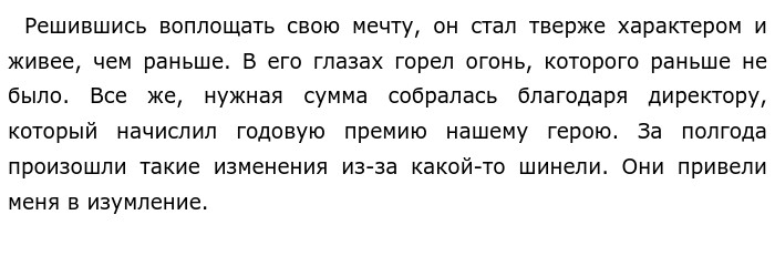 Судьба «маленького» человека по повести Шинель (Гоголь Н. В.)Повесть «Шинель» одна из популярных произведений Николая Гоголя, с которой мы ознакомливаемся в школе. В данной повести ярко выражена судьба маленького человека и его образ. В данной повести им является Акакий Акакиевич Башмачкин. Акакий Акакиевич является титулярным советником. Что касается самого его образа, он низенький, с намечающейся лысиной писарь, служащий в департаменте, где основной его обязанностью было переписывание разного рода бумаг. Не могу не отметить, что к своей работе он подходил очень ответственно. О внешности и одежде он вовсе не волновался. Ключевым моментом в повести стало, что он обнаружил потертости на спине своей форменной шинели. Как раз таки из-за этого шинель не грела. Она стала ещё одной причин насмешек коллег в сторону Акакия. ![]() Через время главный герой снова посещает Петровича, с надеждой что тот починит, но этого не происходит. В свою очередь портной обещает, что сошьет новую для него. Акакий понял, что без новой шинели ему не обойтись, хоть и стоит она дорого. Он знал что Петрович любит преувеличивать и прикинул в голове сумму. На удивление, она оказалась вдвое меньше той, что озвучил портной. Половина этой суммы уже имелась у Башмачкина и он начал откладывать деньги на покупку своей шинели. Он принял серьезные меры для этого: отказался от свечей, чая, реже отдавал вещи в стирку. ![]()