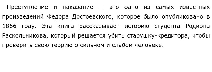 Родион Раскольников — главный герой романа, который страдает от чувства вины и страха перед возможным наказанием со стороны закона, после совершения убийства. Он считает, что люди делятся на сильных и слабых, и что только сильные могут совершать преступления. Раскольников решает проверить свою теорию, убивая старушку-кредитора, которая, по его мнению, была слабым человеком. Однако после убийства Раскольников начинает испытывать чувство вины и страха перед возможным наказанием. Он понимает, что совершил нечто ужасное и не может больше жить с этим грузом на сердце. Раскольников решает признаться в своем преступлении и отправиться в ссылку. Преступление и наказание — это книга, которая затрагивает многие важные темы, такие как мораль, справедливость и человеческая природа. Автор показывает, что даже самые умные и талантливые люди могут совершать преступления, если они не могут справиться со своими внутренними конфликтами. Кроме того, роман отражает проблемы социальной несправедливости и эксплуатации бедных слоев населения. Раскольников, будучи студентом, не мог позволить себе жить в бедности, поэтому он решил убить старушку-кредитора, чтобы получить деньги на свое образование. В целом, Преступление и наказание — это книга, которая показывает, что даже самые сложные жизненные ситуации могут привести к положительным результатам, если мы научимся принимать ответственность за свои поступки и стремиться к самосовершенствованию. Родион Раскольников — это не просто убийца, а человек, который пытался найти смысл в жизни и понять, что такое настоящая справедливость. Его приключения показывают нам, что каждый человек может совершить ошибку, но важно уметь признавать свои ошибки и делать выводы из своих поступков. Обновлено:   Опубликовал(а):  Runemo Внимание! Спасибо за внимание. Полезный материал по теме