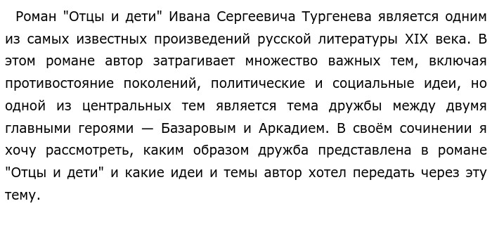 Таким образом, через тему дружбы между Базаровым и Аркадием автор хотел передать идею о том, что дружба может быть как опорой и поддержкой, так и причиной разочарования и разочарования. Дружба становится символом противостояния старых и новых идей, а также возможности нахождения общего языка даже с самыми разными людьми. Итак, каким образом представлена тема дружбы в романе "Отцы и дети"? Дружба между Базаровым и Аркадием играет важную роль в сюжете романа, становясь символом противостояния старых и новых идей. Она является опорой и поддержкой для обоих героев, но также подвергается серьезным испытаниям из-за различий в мировоззрении. Через эту тему автор хотел передать идею о том, что дружба может быть как положительной, так и трагической силой в жизни человека. Обновлено: Опубликовал(а): Алина Лаврухина Внимание! Спасибо за внимание.