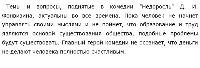 Смысл комедии «Недоросль» (Фонвизин Д. И.)Проблема воспитания и обучения является важной независимо от эпохи, так как она определяет место и судьбу человека в обществе, а также его уровень удовлетворенности жизнью. В комедии "Недоросль" Дениса Ивановича Фонвизина автор противопоставляет такие понятия, как стремление к знаниям и отсутствие интереса к образованию, грубость и воспитанность. Каждый персонаж воплощает свою собственную философию, которая включает и положительные, и отрицательные идеи. Главный герой комедии — Митрофанушка, который является любимым сыном госпожи Простаковой. Он следует наставлениям матери с детства, поэтому не беспокоится о своем будущем, связанном с образованием, развитием и трудом, и не уважает окружающих. Приглашение учителей на дом для Митрофанушки это просто показная сцена, чтобы сохранить свою репутацию перед дворянством. Еще одним фактором, разрушительно влияющим на отношения между матерью и сыном, является слепая любовь матери, которая всегда стоит на его защите в любых ситуациях и не позволяет ему работать. Именно поэтому Митрофанушка растёт человеком, который не придает значения образованию и труду. Его единственная цель в жизни — наслаждаться развлечениями и ждать легких денег. Из-за этого он неуважителен к старшим. Господин Простаков с его покладистым характером, Скотинин, который не понимает сути любви, и расчетливый Кутейкин выглядят нелепо. Противопоставляют им мудрый Стародум, не боящийся работы, и крепостной Тришка, стремящийся к правде. ![]() Такие люди живут в своем мире богатства и невежества. Они являются примерами жестокости и презрения к бедным, а также крайнего неуважения к самим себе. Таким образом, благодаря использованию сатиры, автор "Недоросля" умело разоблачает актуальные вопросы и помогает читателю понять, какую роль играет образование и другие связанные с ним термины в жизни общества. Обновлено: Опубликовал(а): Викториус101927 Внимание! Спасибо за внимание.