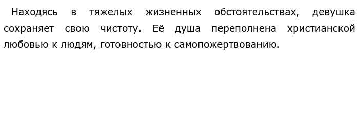 Соня Мармеладова — добрая, хрупкая, скромная и милосердная девушка, которая обладает огромной силой воли и готовностью помогать людям. Она была вынуждена переступить через нравственные законы, ради заработка. Девушка пошла «по жёлтому билету». Соня решилась на это, чтобы спасти от голодной смерти свою семью: отца, мачеху и её детей. Принося домой деньги, она как бы отдавала частицу себя, своего горя и стыда. Даже после смерти отца, она не оставила своих братьев и сестёр в сложной ситуации. Она достойна уважения, каким бы оскорбительным делом она не занималась. ![]()