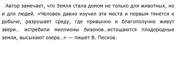 Отношения человека и природы по тексту В. Пескова «Лишь совсем недавно человек узнал, что Земля — это шар…» (ЕГЭ по русскому)Оценка эксперта внизу Как человек должен относиться к природе? Эта проблема оказалась в центре внимания В. Пескова, советского писателя. Чтобы ответить на поставленный вопрос, В. Песков размышляет о долго эволюции нашего мира, о том, какую роль играет природа в жизни людей. ![]() Читатель понимает: своим вмешательством и влиянием человек нарушает закономерности развития природы. Так быть не должно. Людям необходимо беречь свою планету, разумно пользоваться «подарками» природы. Автор сопоставляет такое отношение с мнением учёного. В. Песков пишет: «Во Вселенной мы одни, и не похоже, что где-нибудь нас ждут. Надо беречь свой дом — родную Землю»… Никто не ждет нашей высадки на другие планеты. А Земля по-прежнему нас кормит, даёт нам дышать…» / Нетрудно понять, что необходимо беречь нашу планету, ведь она одна, именно она дает людям жизнь. И даже несмотря на пагубное влияние человека на природу, она также продолжает давать человеку все необходимое для существования. Оба примера противопоставлены друг другу. Зачем это необходимо автору? Так он показывает контраст между варварским отношением человека к природе и её постоянной заботой о человечестве. Позиция автора ясна: необходимо беречь свою планету, бережно относиться ко всем богатствам природы. Я согласна с мнением автора. Действительно, мы должны заботиться о природе, стараться сохранить свою планету. Многие писатели поднимали эту проблему в своих произведениях. В «Песчаной учительнице» А. Платонов повествует о молодом педагоге, которую отправили в село Хошутово. Там она боролась с песками, создала орошаемые огороды, защитные полосы, питомник. Благодаря её работе в селе увеличился урожай трав, оно «позеленело». Нетрудно понять: в результате деятельности Марии Хошутово преобразилось, жизнь в нем стала комфортной. Не вызывает сомнения, люди не должны наносить вред природе, нужно ценить и разумно потреблять ресурсы, которые она дарит человеку. Обновлено: Опубликовал(а): Ekspert Внимание! Спасибо за внимание. Полезный материал по теме