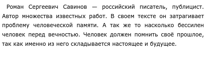 Позиция автора ясна: память связывает наше прошлое и настоящее. Без знания прошлых поколений у нашей цивилизации нет будущего. Всё, чем сейчас пользуется человек было создано благодаря стараниям людей, живших до нас. И все что у нас осталось о них это память о их достижениях, успехах и неудачах. Я полностью согласен со мнением Р. М. Савинова. Ведь если мы перестанем учиться на прошлых ошибках, то человечество погибнет. Люди забудут то насколько ужасно война. Мы перестанем ценить моменты жизни, здесь и сейчас. Память о детстве напрямую влияет на человека и его поведение во взрослом возрасте. Пример этому — роман И. А. Гончарова «Обломов». Главный герой Илья Ильич в детстве был окружен вниманием, любовью. ![]() Память о счастье в детстве повлияла на героя во взрослом возрасте. Она стала основой его жизненного идеала, который направлял его поступки и мысли. В заключении хочется отметить: человек не бессилен перед вечностью, он способен ей противостоять. Помня прошлое, оно не теряется в «бездне», живя в наших сердцах. Обновлено: Опубликовал(а): Федя Внимание! Спасибо за внимание. Полезный материал по теме
