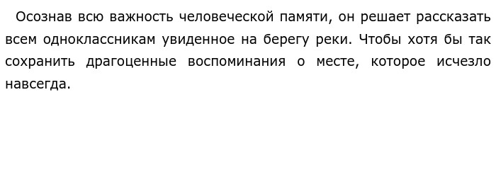 Автор повествует, как в детстве главный герой теста со своим другом Мишекой охраняли пасеку. Но однажды к ним приезжает старик со своим внуком. Парень рассказал ребятам о том, что раньше прямо на этом месте стояла целая деревня. И вот, дедушка уже совсем стар, а деревня исчезла, как будто её здесь никогда и не было. Пример ярко иллюстрирует насколько беспощадно время. Целые здания были полностью разрушены. Затеряны где-то во времени. И все что от нее осталось, это воспоминая старичка. Которые он передал своим детям. После, мы узнаем какие мысли возникают у главного героя после встречи с неожиданным гостем. ![]()