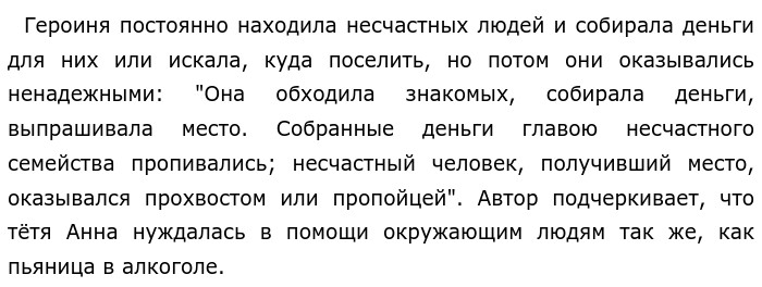 К чему может привести излишняя доброта? По В. И. Вересаеву «У бабушки доброта была гармоничная и умиляла…» (ЕГЭ по русскому)К чему может привести излишняя доброта? На этот вопрос отвечает Викентий Викентьевич Вересаев в предложенном для анализа тексте. Размышляя над желанием человека помочь окружающим, автор описывает жизнь тёти Анны. ![]() Этот пример показывает, что доброта может быть излишней. Далее автор описывает собственную жизнь тёти Анны. Она постоянно брала деньги в долг, чтобы помочь нуждающимся, зарабатывала мало и поэтому не могла обеспечить себе комфортное существование: "Под конец жизни тётя Анна жила в большой нужде в своём доме, приходившем всё в большее разрушение. Сарай грозил обрушиться, подгнившие перемёты еле держались". Автор подчёркивает, что, несмотря на бедную жизнь, тётя Анна всё равно продолжала тратить все деньги на других людей. Этот пример показывает, что чрезмерная доброта приводит к собственной нужде. Примеры связаны причинно-следственными отношениями. Из-за слишком сильного желания материально поддерживать окружающих людей тётя Анна не смогла обеспечить себе комфортное существование. Эта связь помогает читателю понять, что не стоит отдавать все средства на помощь нуждающимся, если не можешь позаботиться о себе. Авторская позиция заключается в том, что излишняя доброта человека может привести к упадку в собственной жизни. Я согласна с мнением писателя. Действительно, важно помогать окружающим, но не приносить при этом вред себе. Моя тётя — активная участница добровольческих движений: организует приют для бездомных собак, различные программы для больных детей, участвует в проведении массовых мероприятий. Она уделяет много времени на помощь окружающим, и у неё остаётся мало сил и энергии на свою семью, детей, которые тоже нуждаются в ней. Так, делая добрые дела, моя тётя жертвует собственным счастьем. Таким образом, прежде всего важно жить для себя, а потом для других. Обновлено: Опубликовал(а): katysha Внимание! Спасибо за внимание. Полезный материал по теме