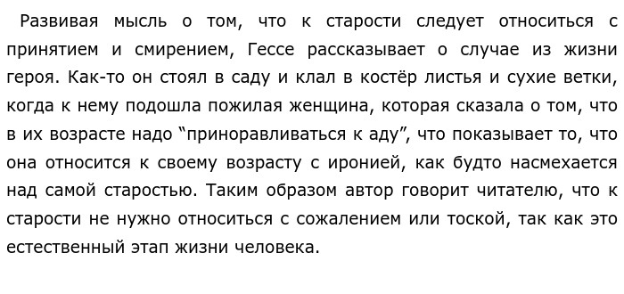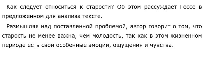 Как следует относиться к старости? По тексту Г. Гессе «Без сомнения, старость — это ступень нашей жизни, имеющая…» (ЕГЭ по русскому)![]() Писатель отмечает, что важно “сказать ей “да”, так как этот этап взросления играет важную роль в человеческой жизни, его значение нельзя умалять. Так становится ясна мысль о том, что пожилые люди должны воспринимать это как возможность испытать новые эмоции, созерцать мир вокруг, а не сокрушаться о наступлении неотвратимого. ![]()