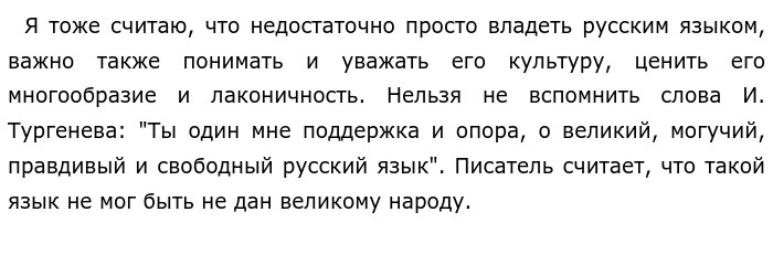 Нужно ли знать историю и культуру русского языка? По тексту Д. С. Лихачёва (ЕГЭ по русскому)Нужно ли знать историю и культуру русского языка? Над этим вопросом задумывается Д. С. Лихачев. Автор рассказывает об истории формирования русского языка, начиная с Древней Руси. О тех преобразованиях, которые прошел язык, на самобытность которого повлияли многие факторы: определённые погодные условия местности, хозяйство, культурное наследие. Сам русский язык отражает национальный характер своего народа, присущие ему эмоциональность, разнообразие и противоречивость. Смысл этого небольшого курса истории русского языка от автора в том, что появление и развитие языка всегда идёт в тесной связи с его историей и культурой, которые каждый носитель русского языка должен знать и уважать. Д. С. Лихачев также размышляет о превосходстве русской литературы и поэзии, которые считаются лучшими в мире в девятнадцатом веке. Существует многообразие жанров, типов литературного языка, которые создавались на протяжении всей истории. Действительно, литература и поэзия играли важную роль в развитии языка, поэтому путь к познанию истории и культуры русского идёт через чтение и изучение отечественной литературы. Оба примера дополняют друг друга и показывают разнообразие и индивидуальность русского языка, его богатую историю и культуру. Д. С. Лихачев убеждён: каждому русскоговорящему человеку необходимо понимать сущность своей культуры, которая строилась много веков. Нужно знать историю пословиц и идиом, литературу, фольклор и поэзию, и только тогда язык откроет всё своё разнообразие и богатство. Я согласна с мнением автора. ![]()