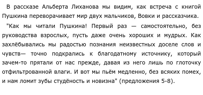 Какое влияние книги оказывают на человека? По тексту А. А. Лиханова «Вовка примчался через десять минут…» (ОГЭ по русскому)Драгоценные книги — это не просто собрание слов на бумаге, это ключи к тайникам человеческой души, это проводники в мир знаний, чувств и смыслов. Это те книги, которые оставляют глубокий след в нашей памяти, обогащают наш внутренний мир, формируют наше мировоззрение и заставляют нас по-новому взглянуть на себя и на окружающий мир. ![]()