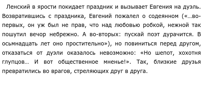 Каковы причины возникновения конфликтов между людьми? Аргументы А. С. Пушкин «Евгений Онегин», И. С. Тургенев «Отцы и дети» (Итоговое сочинение (декабрьское))Человек начинает формироваться с самого рождения. Ребенок познаёт этот мир буквально с нуля, глядя на своё окружение, наблюдая за поведением родителей и сверстников. С возрастом он выбирает манеру поведения в соответствии со своими представлениями о том, что хорошо, а что плохо. Но часто ценности одного человека не совпадают с ценностями и воззрениями на жизнь других людей. Это может стать причиной разногласия, ссоры, причем конфликты случаются как между представителями разных поколений, так и друзьями, сверстниками. Итак, причины конфликтов могут быть разными: это нежелание прислушаться к другому человеку и понять его, личная неприязнь, разные интересы или идейные разногласия. Иногда причина конфликта может крыться как в самом человеке, так и в обществе, его окружающем. Именно такая ситуация описывается в романе А. С. Пушкина «Евгений Онегин». Вспомним сцену именин Татьяны Лариной. На семейный праздник Онегина зазвал Ленский, пообещав: «Кто будет там? своя семья. Поедем, сделай одолженье!» Присутствие Евгения приводит Татьяну в волнение. Состояние Татьяны и полный дом гостей раздражают Онегина, и тот планирует месть Ленскому за приглашение. Когда начинаются танцы, Евгений приглашает Ольгу и не оставляет её даже в перерывах. ![]() А всё это произошло лишь из-за злой шутки Евгения над любовью Ленского. Неумение и нежелание думать о других людях стало поводом для раздражения, желания мести, конфликта, дуэли... Проблема возникновения конфликтов затрагивается и в романе Тургенева «Отцы и дети». Жизнь устроена так, что в ней в спорах, поисках общего языка, компромиссов постоянно происходит смена поколений: старые уступают место молодым. Тема «отцов» и «детей» вечна, как мир, а значит конфликты могут возникать между самыми близкими людьми. Герой романа, Аркадий Кирсанов, окончив курс учебы в Петербурге, возвращается домой. Вместе с ним приезжает его новый друг — Евгений Базаров. Николай Петрович с радостью встречает молодых людей, но радость его вскоре сменяется горечью. Молодые люди называют себя нигилистами, заявляют о своем неприятии всего старого, считая свои идеи истиной в последней инстанции. ![]()