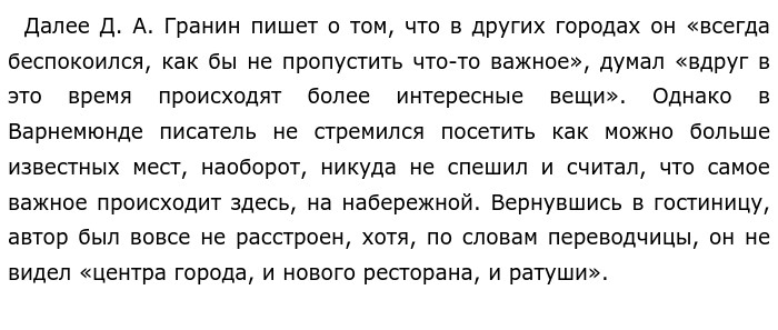 Что в путешествии является наиболее важным? По тексту Д. А. Гранина «Будь у меня путеводитель по Варнемюнде, я бы знал, куда отправиться этим утром…» (ЕГЭ по русскому)«Что в путешествии является наиболее важным?» — данной проблеме посвящён текст Д. А. Гранина. Отвечая на поставленный вопрос, автор пишет о своей прогулке по Варнемюнду, благодаря которой он застал людей за рыбалкой, пообщался со стариком «о ловле камбалы». Смотря на рыбаков, он думал, что начинается какой-то праздник: «Такие праздники приходят внезапно, как подарок, без даты и без повода, просто чистое холодное утро, тяжесть в руках и короткий разговор с незнакомыми людьми, которых потом часто вспоминаешь». Так писатель доносит до читателей мысль о том, что в своих поездках главное разговаривать с местными жителями, наблюдать за их бытом, поскольку именно это и запечатлеется в твоих воспоминаниях. ![]() Становится очевидно, что в путешествии совсем не главное посещение и просмотр огромного количества достопримечательностей. Противопоставление приведённых примеров помогает писателю показать, что хождение по многим известным местам не будет настолько важно, как общение с жителями города, которые впоследствии запомнятся тебе на долгие годы. Позиция автора такова: посещение многих достопримечательностей вовсе не является самой важной вещью в путешествиях, поскольку намного значимее общение с местными жителями и наблюдение за их бытом. Именно это останется в твоей памяти навсегда. Я полностью согласна с мнением Д. А. Гранина. Действительно, в путешествиях главное знакомства с новыми людьми, а не осмотр всех знаменитых мест. Например, когда я была в Санкт-Петербурге вместе с классом, мы посещали очень много музеев и различных выставок, но это было не так интересно, как разговоры с местными жителями. Пообщавшись с ними, мы узнали, что в этом городе живут самые добрые люди, которые всегда помогут тебе найти дорогу, расскажут об архитектурных памятниках. И это гостеприимство оставило гораздо больше впечатления, чем посещение любого музея. Таким образом, в путешествии самым важным является не количество увиденных достопримечательностей, а контакт с местными жителями. Обновлено: Опубликовал(а): Ekspert Внимание! Спасибо за внимание. Полезный материал по теме