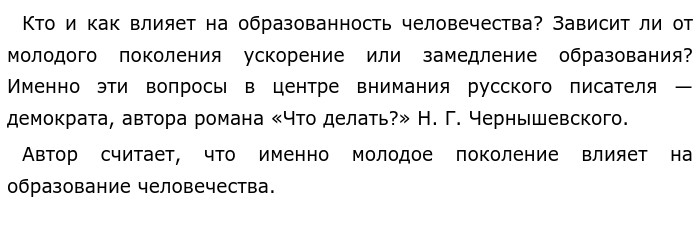 Проблема влияния на образованность человечества по тексту Н. Г. Чернышевского «Неоспоримо, что род человеческий совершенствуется; усовершенствование его простирается на все отрасли жизни его, духовной и телесной…» Дощинский 2025 11 вариант (ЕГЭ по русскому)![]() Юноши должны умножать багаж знаний, унаследованный от их предков, что скажется на научно-техническом прогрессе, на развитии просвещения. Молодые люди, несомненно, обогащая себя знаниями, культурным наследием, доставшимся им от их предшественников, способны положительно повлиять на будущее, на образование человечества. Раскрывая свою позицию, автор использует развёрнутую метафору. Называя знание неисчерпаемым рудником, Он подчёркивает, что владелец получит большие сокровища, если глубже разработает рудник. Из этого следует, что нужно много трудиться, чтобы освоить богатства знаний, выработанных человечеством. Продолжая развивать мысль о пользе просвещения, автор опирается на исторические факты. Так, Западная Римская империя была разрушена, а человеческий ум дремал почти до четырнадцатого века, так как успехи образования замедлились вследствие нежелания римской молодёжи обогащать себя знаниями и развивать их. Таким образом, из-за отсутствия к просвещению великие империи приходят в упадок. Оба примера противопоставлены друг другу, так как автор демонстрирует нам, что страна процветает, если развиваются науки и просвещение. Но в то же время замедление или отсутствие образования приводит государство к разрушению. Я согласна с мнением автора. Действительно, именно от молодого поколения зависит ускорение или замедление образования. Для подтверждения своей мысли приведу пример из истории. Сын поморского рыбака М. В. Ломоносов в девятнадцать лет поступил в академию, упорно трудился, обогащая себя знаниями и стал универсальным учёным, совершившим научные открытия во многих областях знаний. В заключение хочу сказать, что долг каждого молодого человека приобретать знания и использовать их на благо своей страны. Обновлено: Опубликовал(а): Vladimirovna Внимание! Спасибо за внимание. Полезный материал по теме