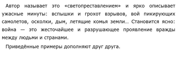 В чём проявляется бесчеловечность войны? По Б. Д. Сурису «Семнадцать, восемнадцать, девятнадцать…» (ЕГЭ по русскому)В чём проявляется бесчеловечность войны? Над этим вопросом задумывается автор книги «Фронтовой дневник» Б. Д. Сурис. Позиция автора очевидна: война — это противоестественное явление, несущее смерть, разруху, уничтожение всего живого на Земле. В тексте автор показывает военную сцену во время авиационного налета немецкого врага на русские войска. Три героя — рассказчик, доктор и солдат Артеменко наблюдают приближение самолетов и пытаются спрятаться в траншее. Рассказчик передает неумолимый ужас перед неизбежной бомбежкой и несравнимыми силами нескольких человек и десятками «юнкерсов». Безжалостность военных действий подчеркивается во многих фразах, в том числе и в следующей: «…десятки тысяч лошадиных сил несли по воздуху сотни тонн бомб, чтобы в сознании собственного превосходства и безнаказанности сбросить их на наши головы». Далее методом градации автор усиливает ощущение трагизма, подчеркивает, как нарастает гул и рокот самолетов, гудение и дрожь земли, приближение неизбежной смерти. Именно в такой ситуации три солдата пытаются хоть как-то сберечься, прячутся опять в щели. Если в начале текста герои текста находятся в ожидании приближения авиации противника, то в конце текста этот ужас уже наступает. ![]() Первый пример показывает, что человек не может понять, как может другая часть человечества решиться на такой жесточайший и безнаказанный поступок, как бомбежка десятками тонн бомб. Второй - дает понять, что, оказывается, есть такие враждебные силы, которые могут разрушить мирный земной порядок существования и разбить мечты мирного населения. Я разделяю мнение автора и тоже считаю, что война — это противоестественное жизни явление, она несет уничтожение миров и не должна иметь место среди людей. Мы никогда не должны забывать, какими жертвами обошлась Вторая мировая война. Во время Отечественной войны 1941-45 годов в Советском Союзе погибло 26 миллионов человек. Да и врагов тоже было убито немало — 18 миллионов человек. Эти цифры говорят о бесчеловечности войны… Таким образом, война — это противоестественное явление, уничтожающее жизнь на нашей планете. Обновлено: Опубликовал(а): Елена Лебедева Внимание! Спасибо за внимание. Полезный материал по теме