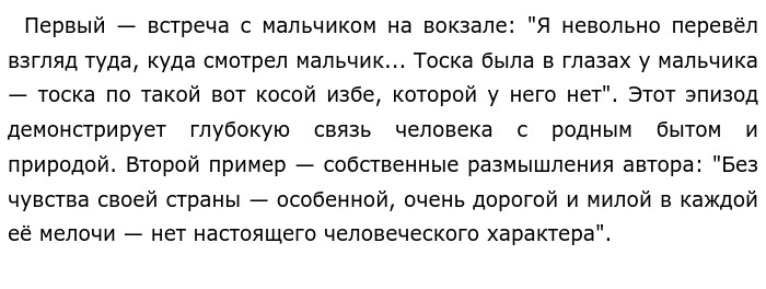 Из чего складывается настоящий человеческий характер? По тексту К. Паустовского «Базарный Сызган. Я запомнил эту станцию из-за одного пустого…» (ЕГЭ по русскому)В представленном тексте К. Г. Паустовский поднимает важную проблему формирования истинно человеческого характера через связь с родной страной и её культурой. Автор показывает, как глубокое чувство принадлежности к своей земле и народу становится основой личностного развития человека. Позиция автора заключается в том, что настоящий человеческий характер формируется через любовь к родной стране, её традициям, природе и людям, через способность замечать красоту в простых вещах и чувствовать единство с народом. Для раскрытия этой позиции автор использует два значимых примера. ![]() Здесь показана неразрывная связь между любовью к родине и формированием личности. Эти примеры взаимосвязаны, так как оба иллюстрируют одну мысль: человек становится цельной личностью только через осознание своей связи с родной землёй и народом. Я полностью согласен с позицией автора. Из историко-культурного опыта известно множество примеров, когда великие люди черпали силы в любви к родине. Например, Лев Толстой, несмотря на аристократическое происхождение, находил вдохновение в крестьянской жизни Ясной Поляны. Современные исследования показывают, что люди, сохраняющие связь с родными местами и традициями, имеют более устойчивую психику и ясное мировоззрение. Таким образом, текст Паустовского помогает понять, что настоящий человеческий характер складывается из любви к родной стране, способности видеть красоту в простых вещах и чувства единства с народом. Только через глубокую связь с родной землёй, её природой и культурой человек может обрести истинную духовную зрелость и стать цельной личностью. Это чувство бескорыстно и наполняет человека великим интересом ко всему окружающему, делая его характер более глубоким и многогранным. Обновлено: Опубликовал(а): Адам Внимание! Спасибо за внимание. Полезный материал по теме