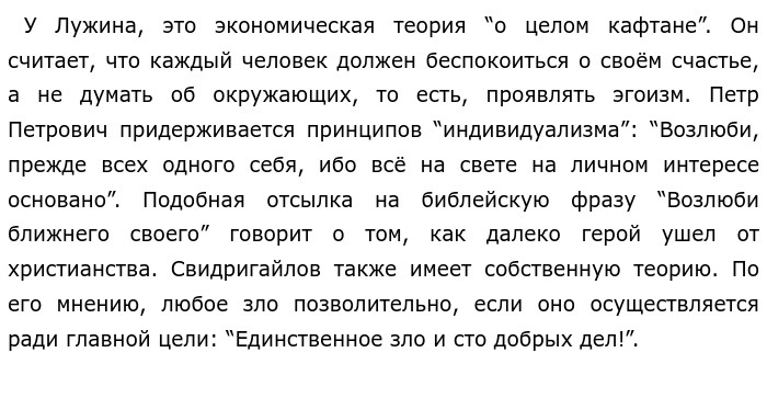 11.2 Почему Лужина и Свидригайлова называют «двойниками» Раскольникова? По роману Ф. М. Достоевского «Преступление и наказание» (ЕГЭ по литературе)Роман “Преступление и наказание” Ф. М. Достоевского — одно из популярных произведений в мире. Литературоведы тщательно разбирали этот роман и многие пришли к выводу, что Свидригайлов и Лужин — это “двойники” Раскольникова. Такое мнение появилось потому, что герои во-многом схожи чертами характера и все трое имеют теорию. Как Родион Романович, так и Аркадий Иванович делают плохие и хорошие поступки. Раскольников несколько раз совершает добрые дела. Так, он помогает пьяной девушке, которую повстречал на одной из улиц Петербурга. Герой просит городового найти извозчика, чтобы тот отвез ее по адресу и дает ему 20 копеек: “он пошарил в кармане и вытащил двадцать копеек”. Данный поступок Родиона Романовича говорит о его искреннем желании помочь, так как в тот момент ему была важна каждая копейка. Свидригайлов также делает доброе дело. Например, он берет все расходы в связи с похоронами Катерины Ивановны. Однако, несмотря на хорошие поступки героев, они оба совершают зло. Так, Раскольников убивает старуху-процентщицу, а Аркадий Иванович доводит до самоубийства лакея Филиппа. Так, образы обоих героев неоднозначны, что говорит об их схожести. Петра Петровича с Родионом Романовичем объединяет наличие гордости. Лужин хвастается тем, что он смог “пробившись из ничтожества…” получить высокий чин надворного советника. Гордость Раскольникова заключается в уверенности в своей исключительности. Примером этого становится его теория о людях “необыкновенных”, которым всё дозволено, и “обыкновенных”, тех, что живут в послушании. По мнению героя, первые имеют право на совершение убийства из-за своего дара. К таким людям он относит и себя, считая себя Наполеоном: “Я хотел Наполеоном сделаться…”. Всех трех персонажей объединяет наличие какой-либо концепции. ![]() Концепции Петра Петровича и Аркадия Ивановича способны привести к преступлениям. Так, оба героя — носители идеи Раскольникова, однако они адаптируют её под себя. Таким образом, Лужина и Свидригайлова можно назвать “двойниками” Родиона Романовича, потому что они имеют общие черты характера и свою собственную теорию, которая может разрушить общество. Образы этих героев показывают то, к чему способна привести идея об “обыкновенных” и “необыкновенных”. Обновлено: Опубликовал(а): Светка Внимание! Спасибо за внимание. Полезный материал по теме