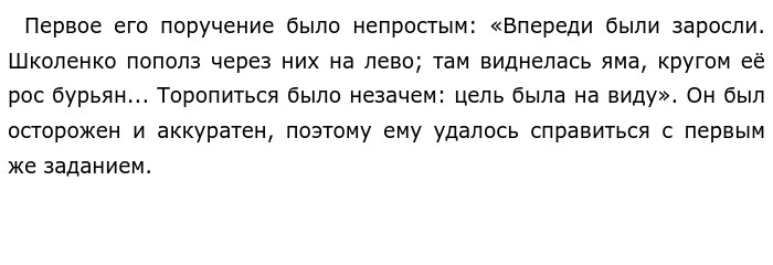 В качестве примера автор пишет о том, как Семён Школенко выполняет поручения командира батальона Кошелева. У Школенко была цель к которой он стремился. ![]()