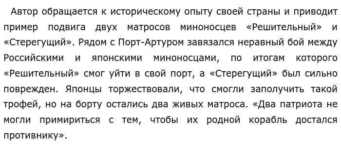 Во имя чего люди совершают подвиги в годы войны? По тексту А. С. Новикова «Две тысячи пятьсот лет назад юноша-римлянин, патриот Муций Сцевола прославил себя…» (ЕГЭ по русскому)Не каждый человек способен совершить подвиг. Зачастую, их совершают люди с чистой душой и безусловной любовью к Родине, чьей главной целью является её защита. Такого мнения придерживается автор текста Алексей Силыч Новиков-Прибой. Он считает, что люди совершают подвиги благодаря огромной любви к Родине, и неоспоримой ненависти к врагам, а также нежелание уступить что-либо противнику. ![]() Далее они совершили действительно героический поступок: забравшись в трюм, моряки открыли кингстоны и корабль, наполняясь водой, пошел на дно, не доставшись врагу. Матросы, отдав свои жизни, проявили настоящее мужество и жертвенность, во имя своей Родины. Продолжая повествование, Алексей Силыч приводит ещё один пример из истории России. На фронте, во время выгрузки баржи, недалеко шел бой. Моряк, находившийся за последней в очереди, приготовился к защите груза. На горизонте появились враги, которых привлек груз. «Когда они подошли совсем близко, застрекотал пулемет в руках моряка». Солдат продолжал совершать точные, но короткие выстрелы, пока кто-то не подплыл сзади и не ударил моряка по голове, лишив сознания. Фашисты пытались его допрашивать, но безрезультатно. «Он предпочёл погибнуть, но не сказал ни слова». Этот человек настоящий герой, ведь он совершил свой подвиг не для того, чтобы прославиться, а ради победы своей страны, также пожертвовав своей жизнью. Автор использует прием сопоставления. Как в первом, так и во втором примере он показывает, как люди жертвуют собой по имя Родины и назло врагам. Нельзя не вспомнить героя истории нашей страны, а именно Ивана Сусанина, который во время вторжения польских интервентов, в ответ на их просьбу довески их до Москвы, совершил подвиг, и завёл их глубоко в глушь, ценой своей жизни, но не предав свою Родину даже по страхом смерти. Итак, в годы войны люди совершают подвиги во имя своей страны. Не у каждого человека может хватить мужества на такие поступки, но герои даже под страхом смерти готовы стоять за свою страну против врага. Обновлено: Опубликовал(а): Jumaisumba Внимание! Спасибо за внимание. Полезный материал по теме