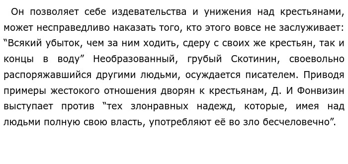 12.1 Какие нравственные проблемы находят своё решение в комедии Д. И. Фонзивина «Недоросль»? (ЕГЭ по литературе)Главным вопросом, занимавшим Д. И. Фонвизина в комедии “Недоросль”, — вопрос о том, каким должен быть истинный дворянин и отвечает ли русское дворянство своему назначению. Размышляя над этим, писатель поднимает и другие, не менее важные проблемы: например, проблему образования и воспитания, невежества и нравственного упадка, человеческого злонравия. Прежде всего стоит обратимся к изображению поместной жизни дворян в комедии “Недоросль”. Д. И. Фонвизин обращает особое внимание на отношения дворян с крестьянами. Простаковы и Скотинин — представители высшего сословия — деспотичные, невежественные люди, с пренебрежением и жестокостью относящиеся к другим. Госпожа Простакова, ругая слугу Тришку за то, что он сшил плохой кафтан, обращается к нему грубо и презрительно, использует такие слова, как «скот», «воровская харя», «болван». Такое поведение характеризует героиню, как беспринципную, невежественную женщину-тирана. Она заботится только о себе, а такие качества, как сочувствие или сожаление ей чужды. Простакова придерживается правила: “Дворянин, когда захочет, и слугу высечь волен”. Скотинин также считает, что он имеет право поступать с подвластными ему людьми так, как ему вздумается: “Да разве дворянин не волен поколотить слугу, когда захочет?”. ![]()