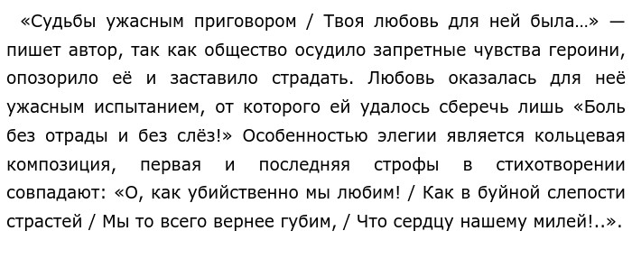 В чём состоит драматизм звучания поэзии Ф. И. Тютчева? На примере не менее трёх произведений (ЕГЭ по литературе)Поэзия Ф. И. Тютчева неповторима и своеобразна, так как в ней есть мотивы драматизма, который заключается в несчастной судьбе возлюбленной лирического героя, разладе человека и природы, а также быстротечности жизни. Элегия «О, как убийственно мы любим…» тесно переплетена с судьбой самого поэта, так как посвящена Елене Денисьевой и входит в «денисьевский цикл». В названии стихотворения уже содержится оксюморон «убийственно мы любим». Любовь, казалось бы, такое светлое и нежное чувство, в творчестве Тютчева трагична. Лирический герой обращается к самому себе, вспоминает роковую первую встречу с избранницей: «Ее волшебны взоры, речи / И смех младенческо-живой?» В начале отношений возлюбленная была прекрасна, её взоры «волшебны». Этот эпитет подчеркивает неземную прелесть девушки, однако спустя год её красота увяла. ![]() Такое построение произведения указывает на то, что лирический герой в конце находит подтверждение своих слов, становится уверен, что причинил боль возлюбленной, погубил её чувствами и заставил страдать. В элегии «С поляны коршун поднялся...» Тютчев раскрывает тему человека и природы. Стихотворение построено на антитезе, противопоставлении лирического героя и птицы. «С поляны коршун поднялся, / Высоко к небу он взвился...» — первая строфа начинается с изображения коршуна, способного на полет. Однако «мощными», «живыми» крыльями его одарила «природа-мать», как называет её автор, используя такой приём как олицетворение, так как она — создательница всего живого на земле. Однако лирический герой не способен парить в небесах. «А я здесь в поте и в пыли, / Я, царь земли, прирос к земли!...» — гласят последние строчки, показывая человеческую гордыню, самомнение. Герой считал себя главным в этом мире, непобедимым, лучшим существом, однако осознал, что по сравнению с силами природы он ничтожен, ограничен в своих силах. В стихотворении четко прослеживается авторская ирония, обличающая разлад человека с природой. В элегии «Есть в осени первоначальной…» изображается картина осени. Автор называет её «Короткая, но дивная пора…», подчеркивая её малую длительность. По законам природы после осени наступает зима, однако со сменой времён года можно сравнить и быстротечность жизни, так как холодная, суровая пора символизирует смерть лирического героя. Бабье лето, образ которого прослеживается в стихотворении, это грань как между летним изобилием и осенним увяданьем, так и между жизнью и смертью. «Лишь паутины тонкий волос / Блестит на праздной борозде», — данная метафора может означать, что лирический герой уже поседел, он не молод, однако уход в мир иной ему предстоит ещё не скоро. Подтверждение этой мысли можно найти в следующих строках: «Пустеет воздух, птиц не слышно боле, / Но далеко еще до первых зимних бурь…». Идея элегии состоит в том, что даже в зрелом возрасте, несмотря на короткий срок жизни и приближение смерти, бывают светлые, прекрасные моменты. Таким образом, поэзия Ф. И. Тютчева драматична, так как поэт в своём творчестве поднимает темы губительной, несчастной любви, разлада человека с природой, а также быстротечности жизни. Обновлено: Опубликовал(а): Анастасия Чуманова Внимание! Спасибо за внимание. Полезный мат