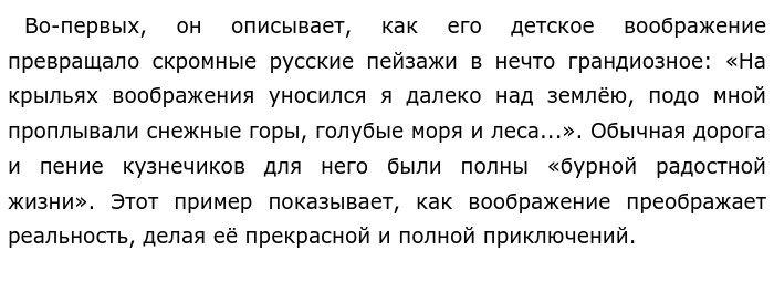 Позиция автора очевидна и раскрывается ярко и поэтично. Соколов-Микитов убеждён, что воображение — это бесценный дар, который позволяет человеку выйти за границы обыденности, обогащает его внутренний мир, делает реальность волшебной и является источником радости и силы, сохраняющимся даже во взрослой жизни. Чтобы обосновать свою точку зрения, автор использует яркие примеры-иллюстрации из собственного детства. ![]()