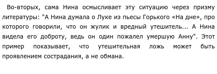 Ложь во спасение по тексту М. В. Глушко «С работы в этот раз Нина возвращалась поздно. Дверь почему-то оказалась открытой, в тёмной комнате было холодно, плита не топилась…» (ЕГЭ по русскому)В предложенном для анализа тексте Мария Васильевна Глушко поднимает сложную нравственную проблему спасительной лжи. Автор размышляет о том, может ли неправда быть оправдана, если она помогает человеку пережить тяжелое потрясение. Позиция автора раскрывается через размышления главной героини Нины. Глушко убеждена, что в некоторых исключительных случаях, когда правда может сломать человеческую душу, ложь во спасение не только допустима, но и необходима. Она выступает как форма милосердия и защиты психики человека от непереносимой боли. Чтобы раскрыть эту позицию, автор приводит два ключевых примера-иллюстрации. Во-первых, это реакция Ипполитовны на горе Евгении Ивановны: "Похоронки-то кто пишет? Писари. А они при штабах, там бумаг страсть сколько... Вот и попутали". Старушка сознательно предлагает версию о возможной ошибке, чтобы дать Евгении Ивановне надежду и время примириться с горем. ![]()