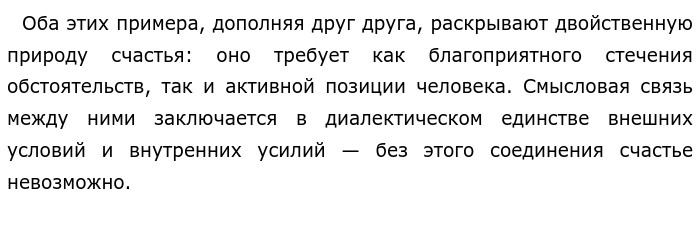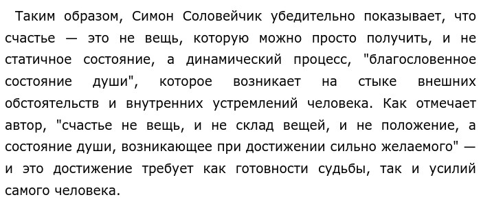Проблема природы счастья по тексту С. Л. Соловейчика «Однажды я ехал в электричке. Сидевшая рядом со мной у окна скромно одетая сдержанная женщина открыла томик Чехова…» (ЕГЭ по русскому)В предложенном для анализа тексте Симон Львович Соловейчик поднимает глубокую философскую проблему природы счастья и возможности его достижения. Автор размышляет о том, является ли счастье даром судьбы или результатом усилий человека. Позиция автора раскрывается через лингвистический анализ и философские размышления. Соловейчик приходит к выводу, что счастье — это результат встречного движения: с одной стороны, необходима благоприятная возможность, предоставляемая судьбой, а с другой — активное стремление человека, его готовность "добыть" свое счастье. Оно не является пассивным даром, а требует внутренней работы и усилий. Чтобы раскрыть эту позицию, автор приводит два ключевых примера-иллюстрации. Во-первых, он анализирует языковые выражения, связанные со счастьем: "счастливая доля", "счастливый случай", "счастье привалило". Эти фразы подчеркивают роль фортуны, элемента удачи в понятии счастья. Во-вторых, писатель обращает внимание на другие выражения: "нашёл своё счастье", "добыл счастье", "достиг счастья", "всякий человек — кузнец своего счастья". Эти словосочетания свидетельствуют о необходимости активных действий, усилий и борьбы для достижения счастья. ![]()