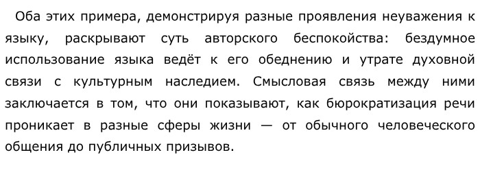 Позиция автора раскрывается через его эмоциональную реакцию на случаи безграмотного и бездушного использования русского языка. Паустовский убеждён, что мы становимся "нерадивыми потомками", когда проявляем равнодушие к великому наследию, переданному нам предыдущими поколениями, когда позволяем обеднять и искажать язык, который создавался и шлифовался веками. Чтобы раскрыть эту позицию, автор приводит два ключевых примера-иллюстрации. Во-первых, это сцена на берегу Оки, где человек в черном френче использует казённые, безличные выражения: "Закругляйте купаться!", "Лимит времени прошу соблюдать!". Эти фразы, лишённые образности и теплоты, противопоставляются богатству окружающей природы и воспринимаются автором как проявление духовной бедности. Во-вторых, писатель описывает увиденный на дороге плакат с безграмотным и нелепым лозунгом: "Доярки, выполняйте среднефермские обязательства надоя!". Этот пример показывает, как язык может превращаться в набор канцеляризмов, теряя свою живую силу и красоту. ![]()