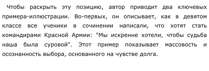 Проблема идеалов и ценностей предвоенного поколения по тексту Б. Л. Васильева «От нашего класса у меня остались воспоминания и одна фотография…» (ЕГЭ по русскому)В предложенном для анализа тексте Борис Львович Васильев поднимает важную проблему идеалов и ценностей предвоенного поколения. Автор размышляет о том, почему для молодых людей того времени военная профессия была не просто выбором, а осознанным жизненным путем. Позиция автора раскрывается через воспоминания о своем классе и общую атмосферу эпохи. Васильев убеждён, что стремление всех ребят стать военными было вызвано не романтическими представлениями, а глубоким пониманием исторического момента, чувством ответственности перед страной и искренним желанием выбрать "мужскую" профессию, готовя себя к суровой, но необходимой защите Родины. ![]()