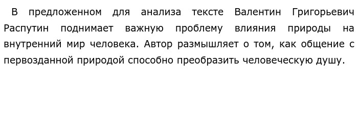 Проблема влияния природы по тексту В. Г. Распутина «И всё-таки у Природы как целого, как единого творца есть свои любимцы, в которые она при строительстве вкладывает особенное старание, которые отделывает с особенным тщанием и наделяет особенной властью…» (ЕГЭ по русскому)![]()
