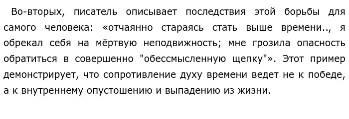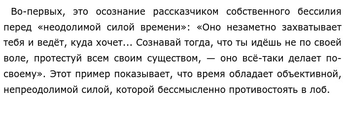 Проблема взаимоотношений человека и времени по тексту В. В. Вересаева «Зачем я от времени зависеть буду?» (ЕГЭ по русскому)В предложенном для анализа тексте Викентий Викентьевич Вересаев поднимает сложную философскую проблему взаимоотношений человека и времени. Автор размышляет о том, способен ли человек противостоять давлению эпохи, сохранить свои убеждения в условиях меняющейся действительности. Позиция автора раскрывается через внутренние переживания героя-рассказчика. Вересаев приходит к выводу, что обогнать время или стать выше него невозможно. Попытка противостоять эпохе в одиночку приводит к мучительному внутреннему конфликту и ощущению бессилия. Единственное спасение автор видит не в борьбе с временем, а в полном погружении в конкретное, полезное дело, которое придает жизни смысл. Чтобы раскрыть эту позицию, автор приводит два ключевых примера-иллюстрации. ![]()