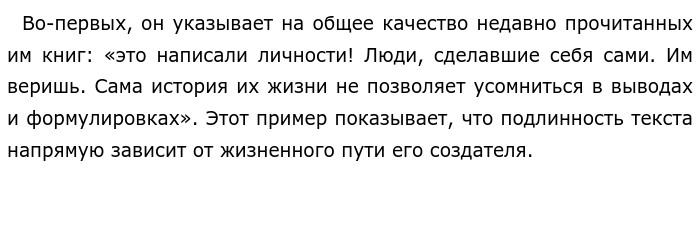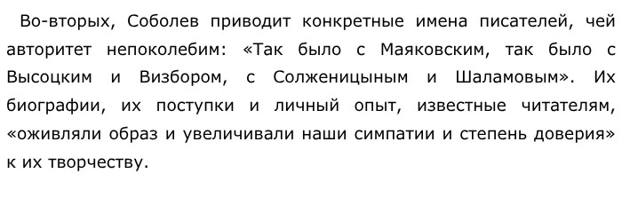 Критерии подлинной литературы по тексту А. Н. Соболева «В наше время чтение художественной литературы, по сути, привилегия…» (ЕГЭ по русскому)В предложенном для анализа тексте Андрей Николаевич Соболев размышляет о критериях подлинной, настоящей литературы в современном мире, где чтение стало для многих непозволительной роскошью. Автор исследует вопрос, какие произведения выдерживают испытание временем и доверием читателя. Позиция автора чётко сформулирована в конце текста и подкреплена его рассуждениями. Соболев убеждён, что главным критерием настоящей литературы является способность автора вызвать у читателя безусловное доверие. Такое доверие рождается не только из писательского таланта, но и из личного опыта, из биографии писателя, которая служит гарантом искренности и правды его слов. Чтобы раскрыть эту позицию, автор приводит два ключевых примера-иллюстрации. ![]()