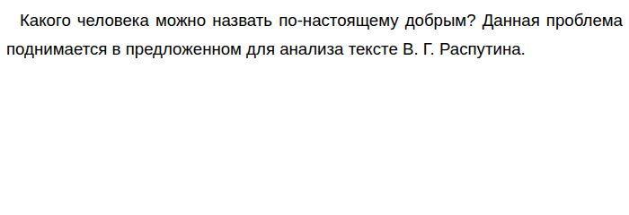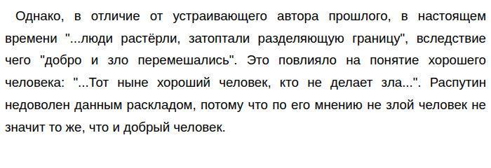 Какого человека можно назвать по-настоящему добрым? По тексту В. Г. Распутина «Всё чаще, решившись на переезд…» (ЕГЭ по русскому)![]() Позиция автора такова: по-настоящему добрым является тот человек, который выбрал сторону добра, и остается на ней всегда. Главным лицом текста является Иван Петрович, являющийся обычным работником. Именно от его лица идет рассуждение на разные темы на протяжение всего текста. Все мысли Ивана Петровича — это отражение мыслей самого Распутина. Итак, во время рассуждения о нашей проблеме, рассказывается о "прежнем" времени, когда "...добро и зло отличались, имели собственный чёткий образ" и все были "...направлены в одну сторону — к добру", а с каждым поколением становилось все больше добрых людей. Писатель считает, что между добром и злом должна существовать четкая граница, которую добрые люди никогда переступят, а злые наоборот рано или поздно перейдут на сторону добра. ![]()