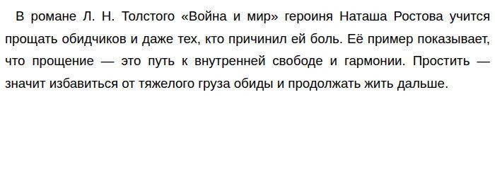 Что легче — отомстить обидчику или простить его? Аргументы Ф. М. Достоевский «Преступление и наказание», А. П. Чехов «Дядя Ваня», Л. Н. Толстой «Война и мир» (Итоговое сочинение (декабрьское))В жизни каждого человека возникают ситуации, когда его оскорбляют или причиняют боль. В таких моментах возникает вопрос: что легче — отомстить обидчику или простить его? Этот выбор зависит от характера человека, его внутренней духовной силы и жизненных ценностей. В литературе часто поднимается эта тема, показывая, что простить бывает сложнее, чем отомстить, но именно прощение приносит внутреннее спокойствие и свободу. Мне кажется, многие герои произведений выбирают путь мести, потому что это кажется им более простым и естественным. Например, в романе Ф. М. Достоевского «Преступление и наказание» Раскольников сначала думает о том, чтобы избавиться от своих мучений, совершив убийство. Вначале он испытывает желание отомстить обществу за свое страдание, но в итоге понимает, что месть не приносит ему облегчения. Только через раскаяние и принятие своей вины он находит возможность простить самого себя и окружающих. Этот пример показывает, что путь к внутреннему миру лежит скорее через прощение, чем через месть. С другой стороны, герои, выбравшие путь мести, насколько я заметил, часто оказываются в более тяжелом положении. В пьесе А. П. Чехова «Дядя Ваня» персонаж Войницкий, обиженный на окружающих, мечтает о мести, но в итоге понимает, что это только разрушает его внутренний мир. Прощение кажется ему слишком трудным, и он предпочитает избегать конфликта, что показывает, как трудно преодолеть желание отомстить. Я думаю, именно способность простить — это проявление силы духа. ![]()