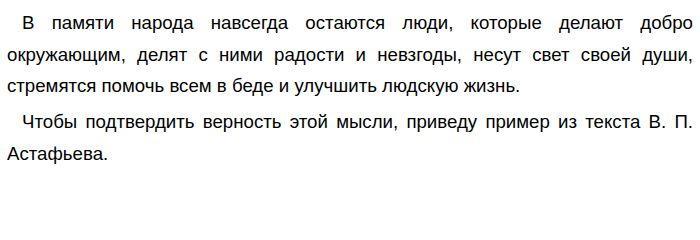 Какие люди навсегда остаются в памяти народа? По тексту В. П. Астафьева «Весной учитель стал водить наш класс по лесу и рассказывать про деревья, про цветы, про травы, про речки и про небо…» Дощинский 2026 2 вариант (ОГЭ по русскому)![]() В этом тексте рассказывается о сельском учителе, который «растворился в памяти народа». Он водил детей на экскурсию в лес, щедро делился с учениками своими знаниями, рассказывая им о деревьях, травах, цветах. И сам внимательно слушал деревенских ребятишек, которые давали ему сведения о том, как, например, спастись от лесного пожара. Таким образом, педагог проводил много времени со своими подопечными на природе, обогащал их новыми знаниями и сам многому учился у ребят, именно поэтому он запомнился ученикам, которые всю жизнь испытывали к нему благодарность. Приведу второй пример из этого же текста. Во время экскурсии дети увидели змею. Учитель не растерялся, не показал своего страха, хотя и побледнел. Он схватил палку и стал бить гада. Позже дети объяснили педагогу, почему нельзя было бить веткой через плечо: змея могла обвиться вокруг палки и наброситься на человека. А когда ученики выяснили, что учитель раньше никогда не видел змей, так как он жил в такой местности, где не водились гады. Они подумали, что именно они должны были оборонять наставника, а не он их. Таким образом, в этом эпизоде учитель проявляет смелость и ответственность, спасает своих учеников от беды. На основании двух примеров можно сделать вывод о том, что благородные и добрые, простые и скромные, самоотверженные и бескорыстные люди, каким был учитель в данном тексте, которые живут вместе с народом, делят с ним печали и радости, служат им, несут добро и свет, навсегда остаются в людской памяти. Обновлено: Опубликовал(а): Vladimirovna Внимание! Спасибо за внимание. Полезный материал по теме